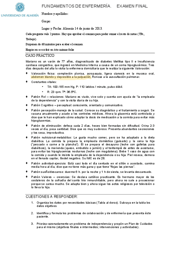 Casos clínicos de fundamentos de la enfermería subidos al aula virtual, proceso enfermero practica para examen.