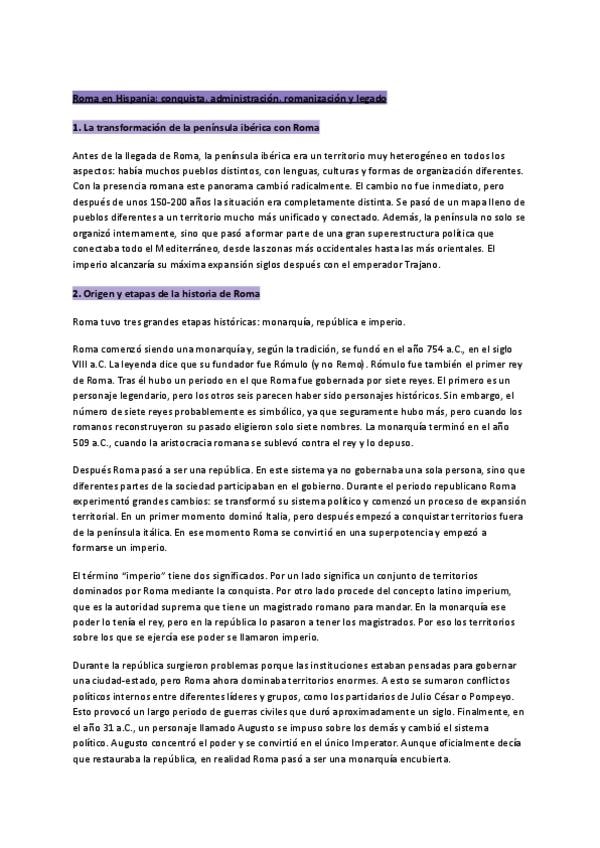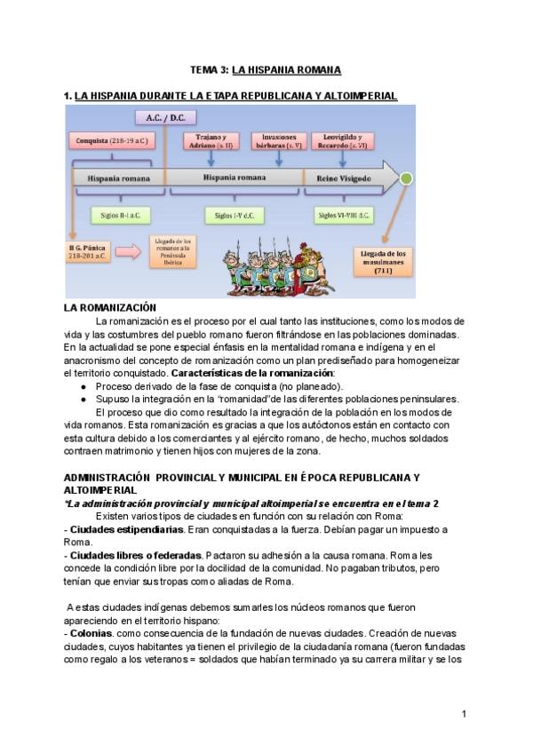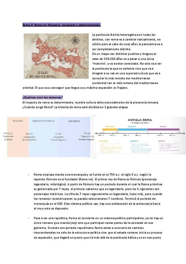 Tema 3 LA HISPANIA ROMANA. Cuenta con los apuntes teóricos, de clase y los respectivos comentarios de texto para superar el parcial de la Historia antigua.