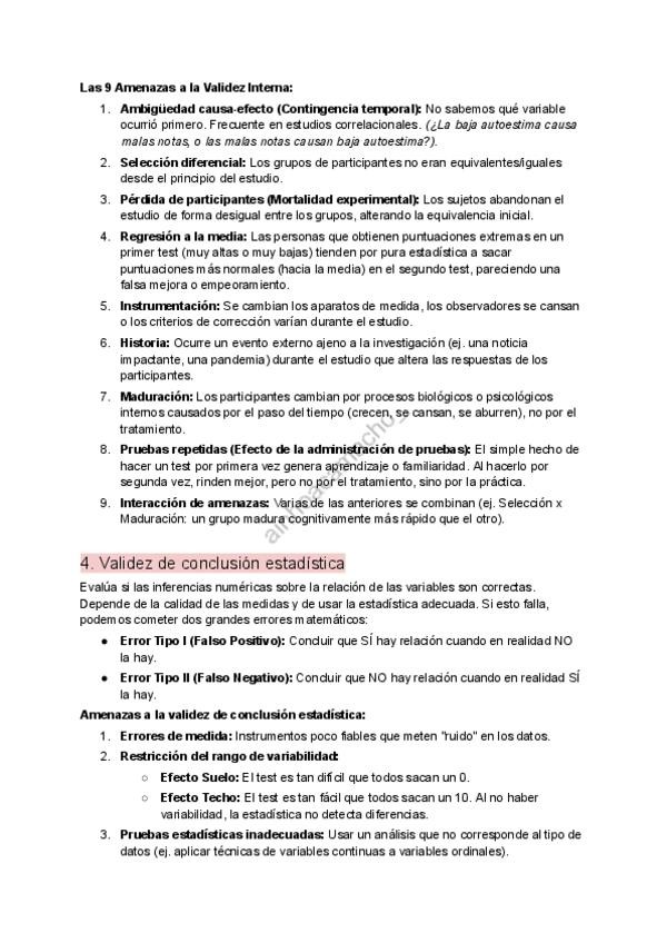 El TEMA 3 de Fundamentos de Investigación (Sanz Aparicio) Diferencia clara entre Error Tipo I y Error Tipo II. Las 9 Amenazas a la Validez Interna explicadas (Regresión a la media, Historia, Maduración, Mortalidad...). Amenazas Estadísticas: Qué es el E