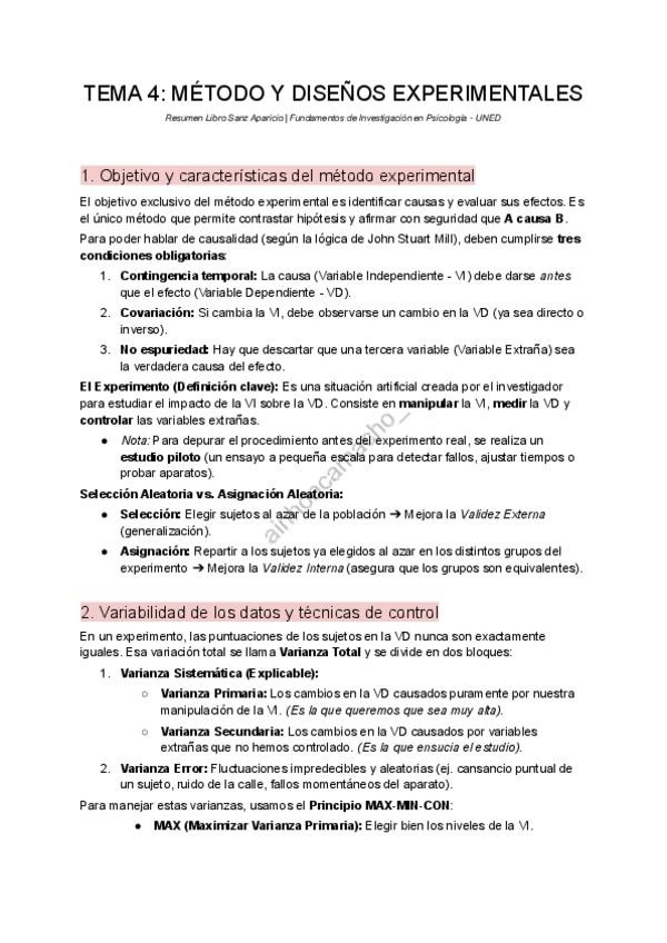 Resumen Tema 4 (Sanz Aparicio) Diferencia entre Selección Aleatoria y Asignación Aleatoria. Principio MAX-MIN-CON y los tipos de Varianza. Diferencia entre Técnica de Bloqueo y Diseños Intragrupo. Los peligros del Error Progresivo y el Efecto Residual. E