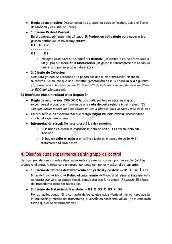 El Tema 6 de Fundamentos de Investigación (Sanz Aparicio). Diferencia entre cuasiexperimento y experimento (la no aleatorización). Saber leer las fórmulas con O, X y X̄. Diseños preexperimentales: Por qué NO demuestran causalidad. Diferencia entre regla