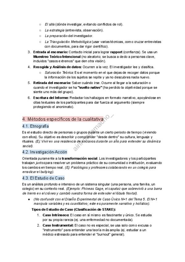 El tema 10 de Fundamentos de Investigación (Sanz Aparicio). Diferencia básica: Enfoque Idiográfico vs Nomotético. Fases: El Diseño Emergente y qué significa llegar a la "Saturación Teórica" o "Volverse nativo". Tipos de Estudio de Caso de Stake (Intrínse