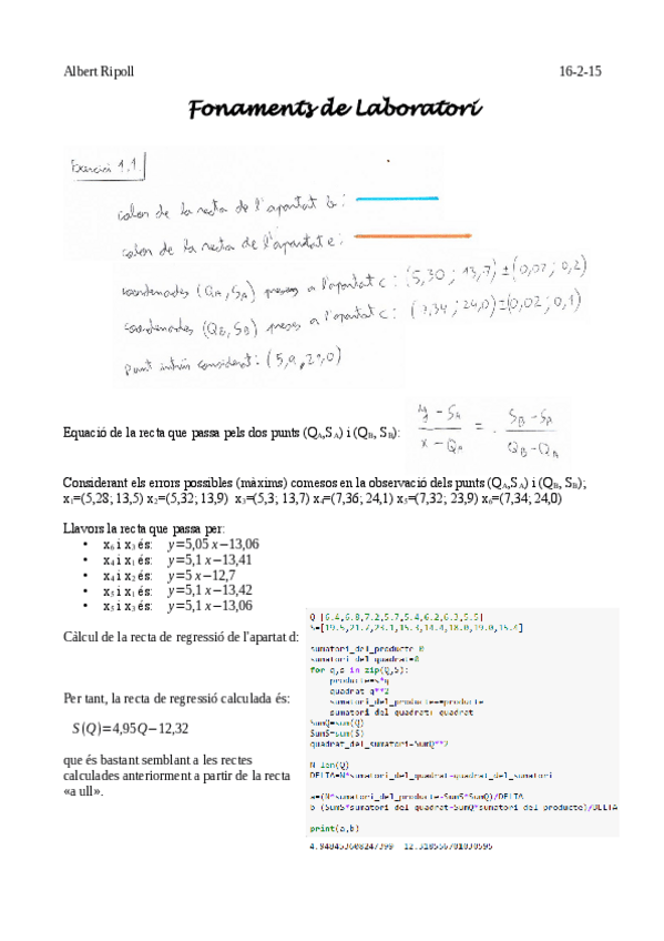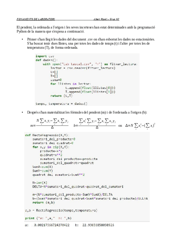 Programació en Python perquè et doni els paràmetres pendent i ordenada + Error a partir d'uns punts.