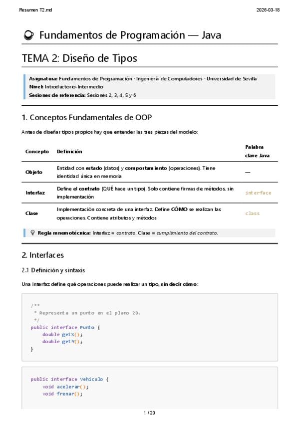 Resumen Tema 2 Diseño de Tipos en Java, del Segundo Cuatrimestre de Fundamentos de Programación