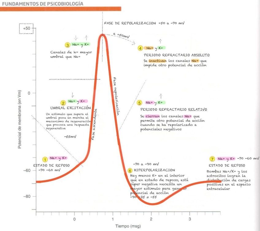 Diagrama/esquema fases del potencial de acción. Tema 7 fundamentos de psicobiología 1°cuatri