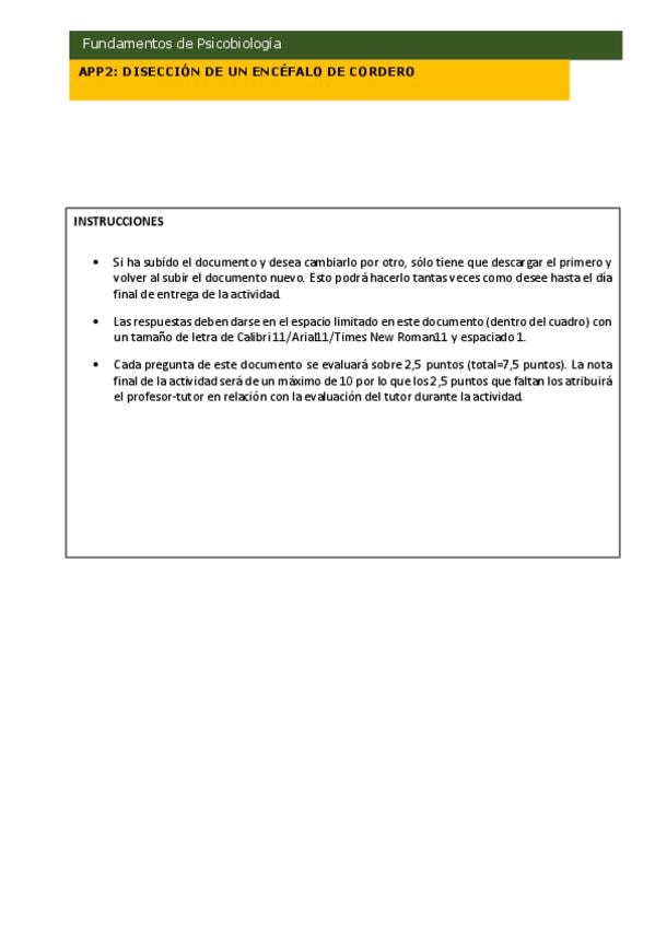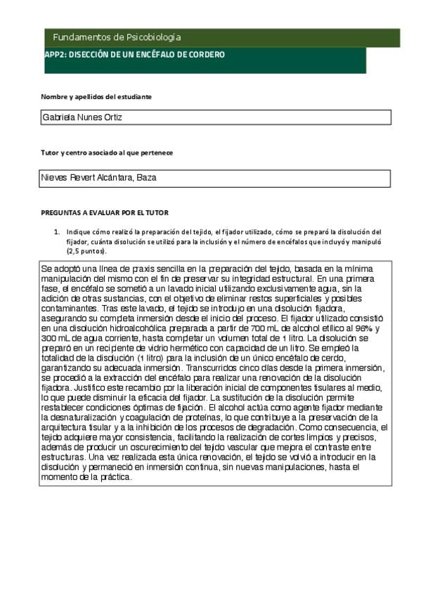 Mis soluciones al cuestionario de la APP3: Disección de un encéfalo de cordero de Fundamentos de Psicobiología, del año académico 2025-2026. No sé por qué el documento pone APP2, pero en mi centro asociado, ha correspondido a la práctica nº3. Está correg