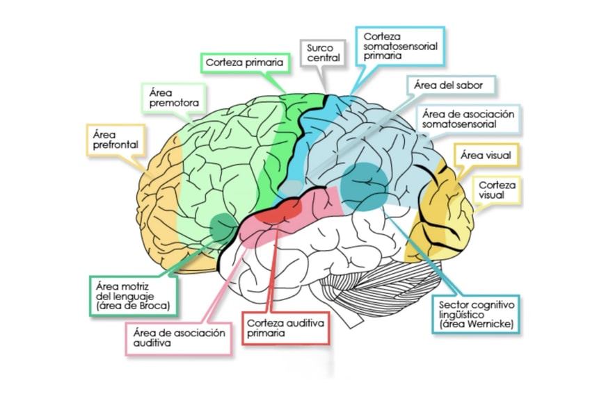 Lámina de los órganos de los sentidos y las áreas de los lóbulos de la corteza con las que se relacionan. (Capítulo 11, Los Sistemas Sensoriales, Fundamentos de Psicobiología)