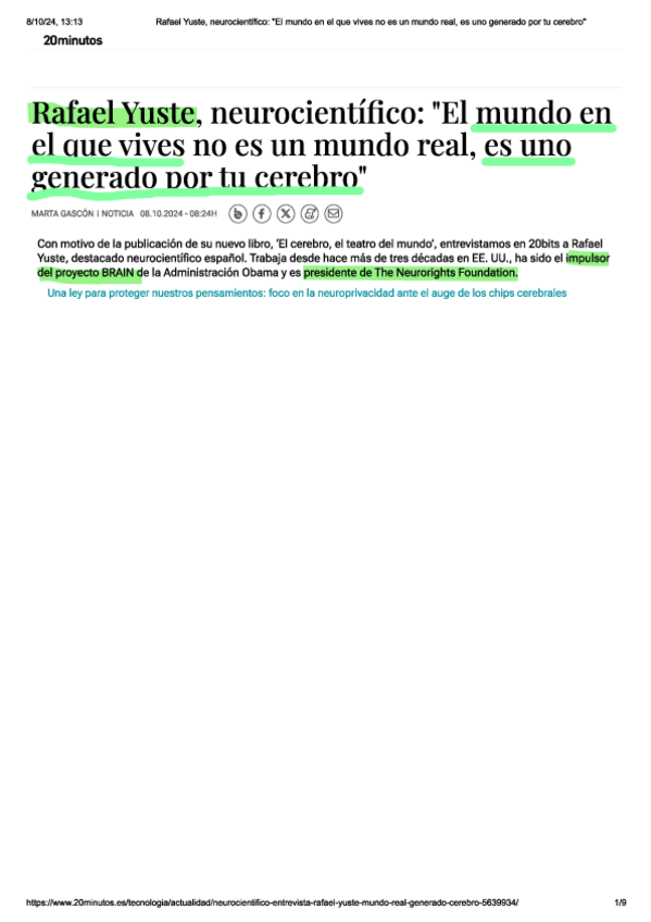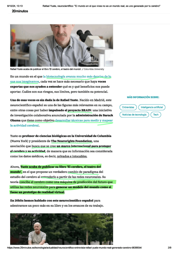 Pequeña lectura acerca del futuro de la Neurociencia a modo de entrevista con Rafael Yuste. Os la dejo subrayada por si os ameniza o facilita la tarea :)