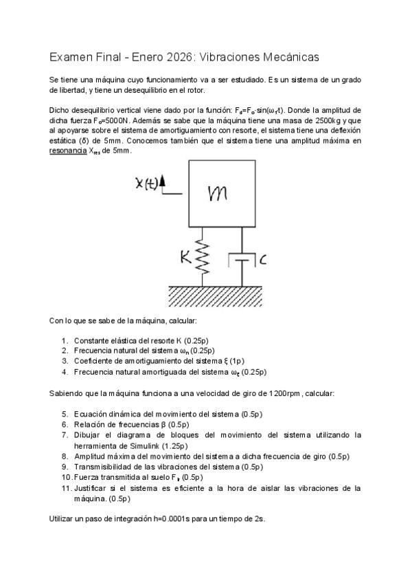 Aquí os dejo el examen de vibraciones mecánicas de Enero de 2026, es muy muy interesante y aunque los apartados igual no son idénticos a los del examen, se aproximan mucho (los escribí de memoria)