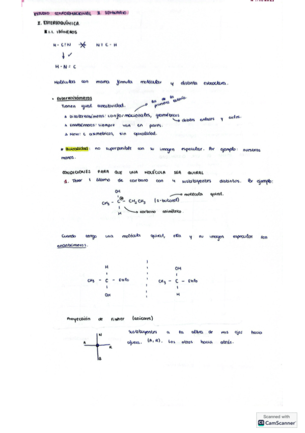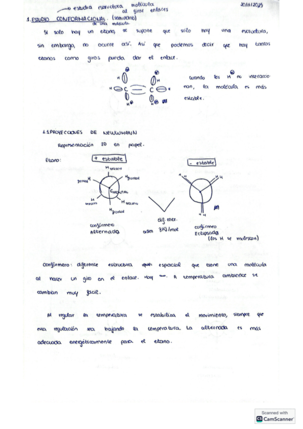 Apuntes tomados a mano durante el seminario de estudio conformacional de fundamentos en química.