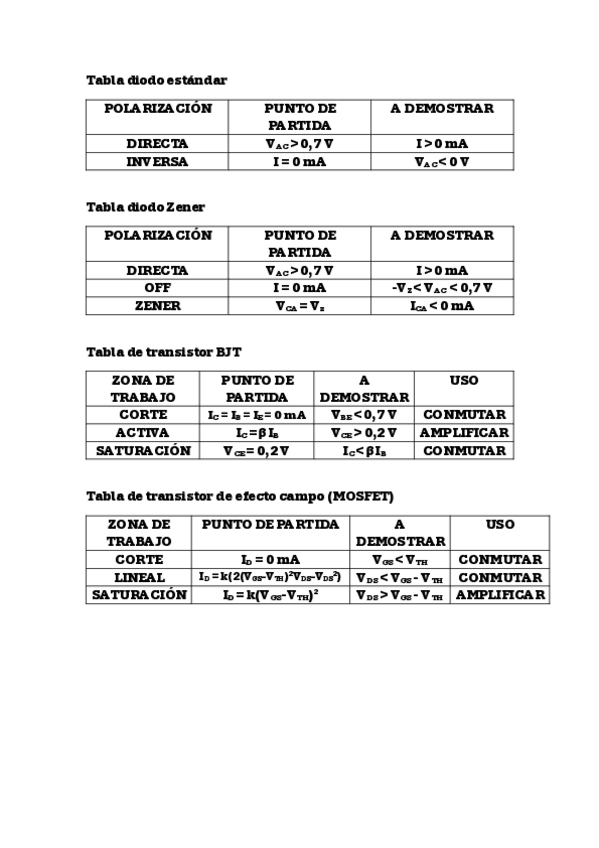 Tablas con los métodos de resolución de problemas con diodos y transistores.