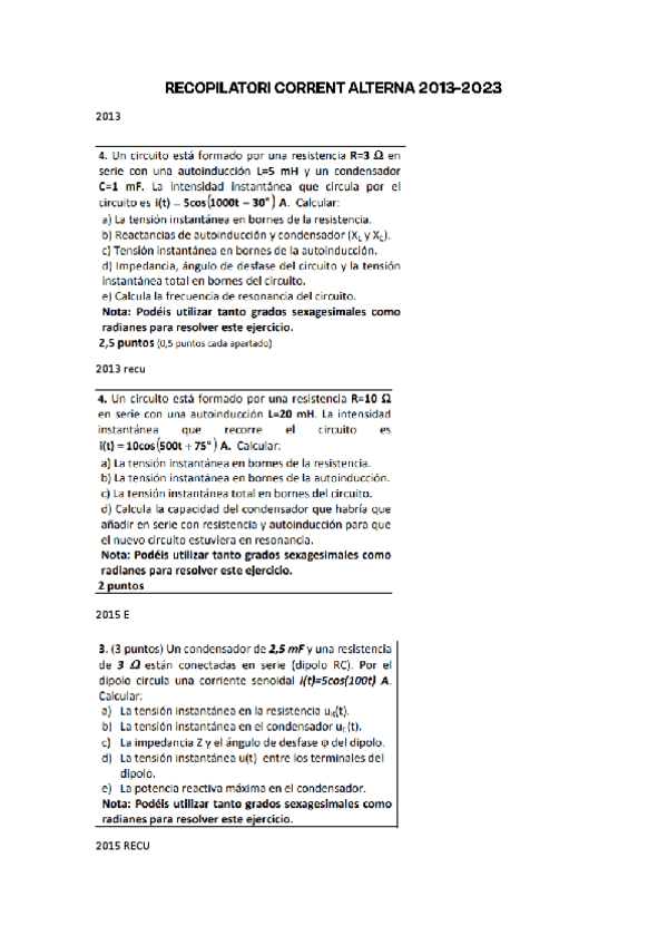 CORRIENTE ALTERNA EJERCICIOS EXAMEN Desde 2013 hasta 2023