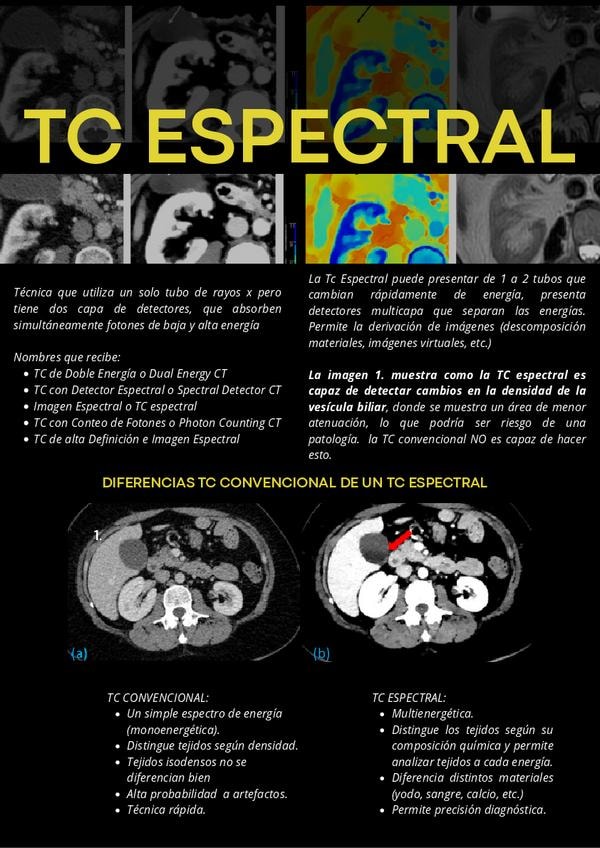 Cartel que detalla que es la TC espectral, diferencias con una helicoidal multicorte, como se ve en imagen, etc.