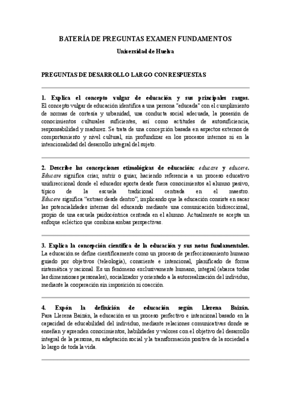 Batería de preguntas de la asignatura fundamentos pedagógico. Con sus correcciones. Caen en examen.