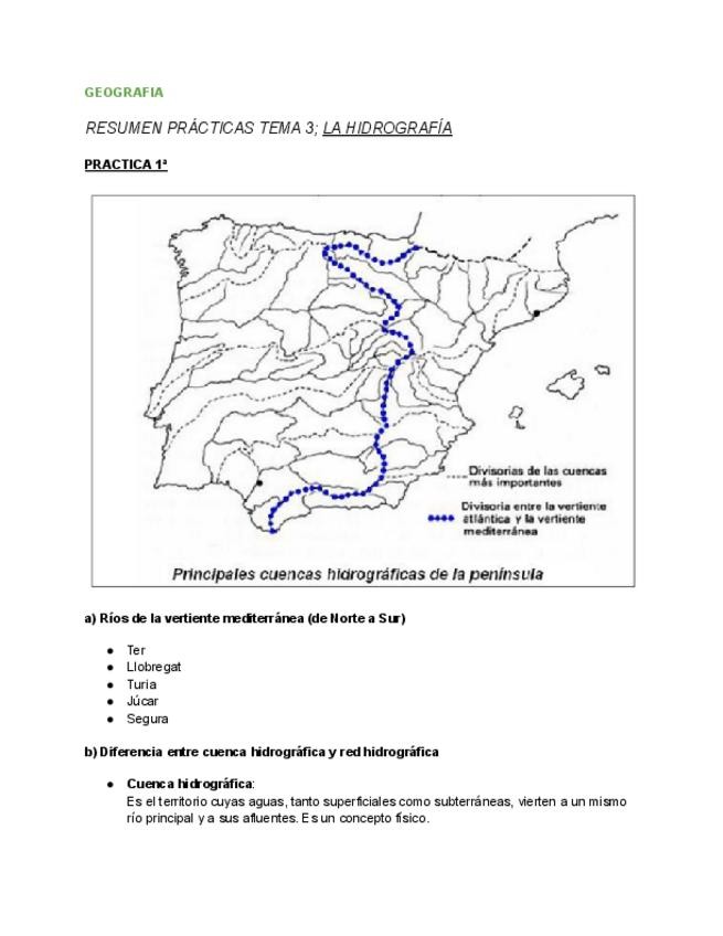 CreadoresEste documento recoge las prácticas del Tema 3, centradas en el estudio de la hidrografía: ríos, cuencas hidrográficas, vertientes, mares y océanos. Incluye ejercicios resueltos, definiciones clave, esquemas y mapas que facilitan la comprensión del conten