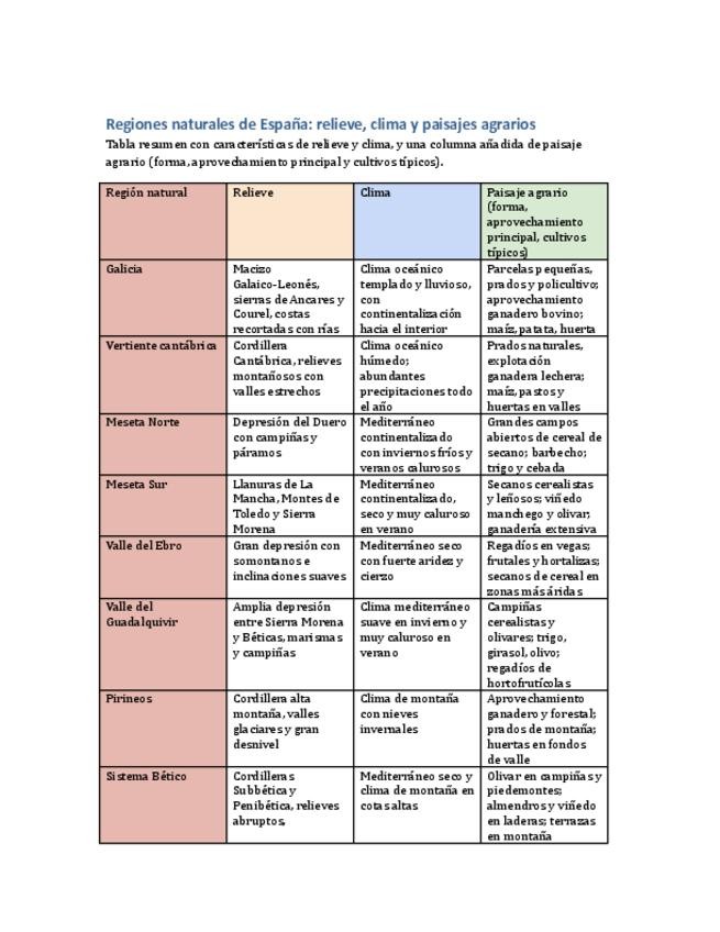 Tabla a modo de resumen recopilatorio de relieve, clima y paisaje agrario (vegetación está en el otro cuadro que publiqué) :)