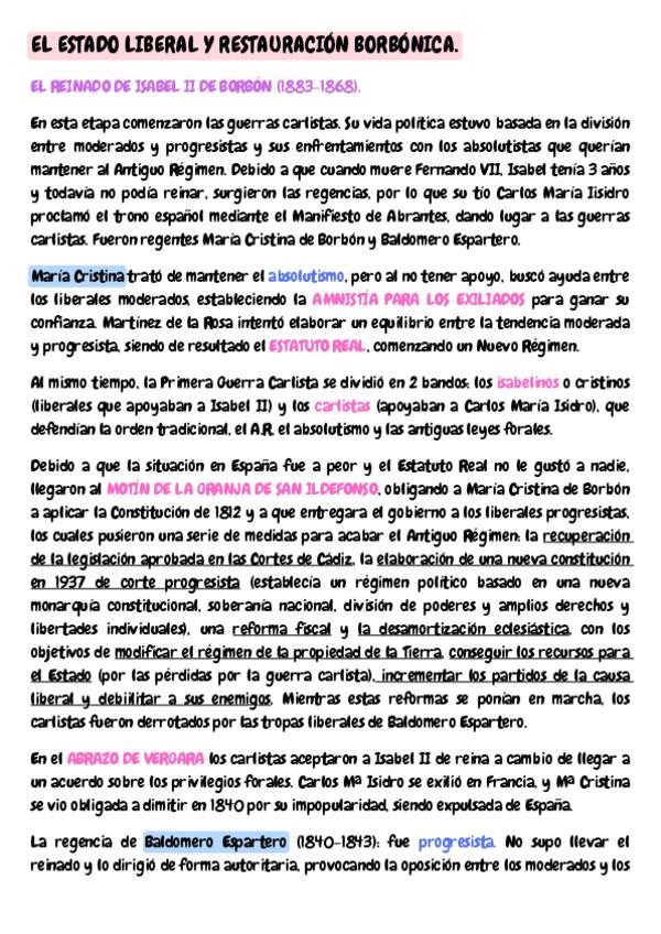 Resumen del Estado Liberal y Restauración Borbónica. Está subrayado por colores, muy bien explicado y he sacado un 10 en este examen, espero que os ayude.