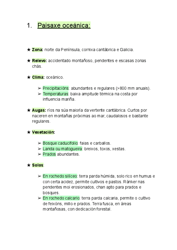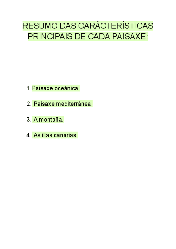 Resumo das características principais de cada paisaxe para un comentario: zona, relevo, clima, augas, vexetación e solo.