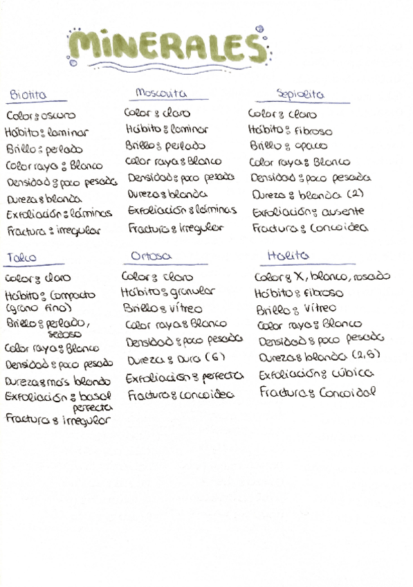 Resumen/tablas para reconocimiento de minerales y clasificación y procesos de formación de rocas metamórficas, ígneas y sedimentarias.
