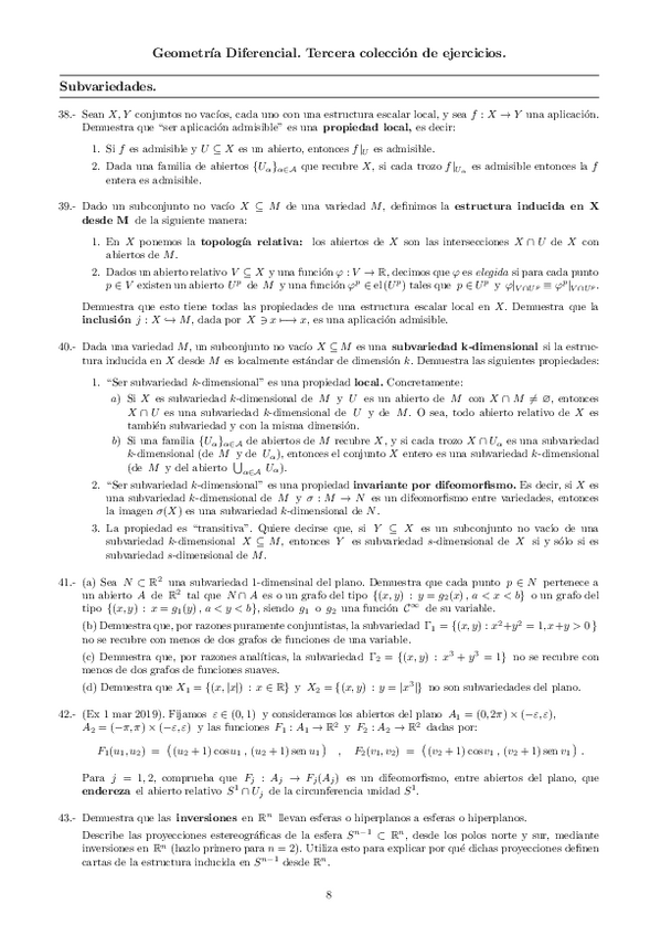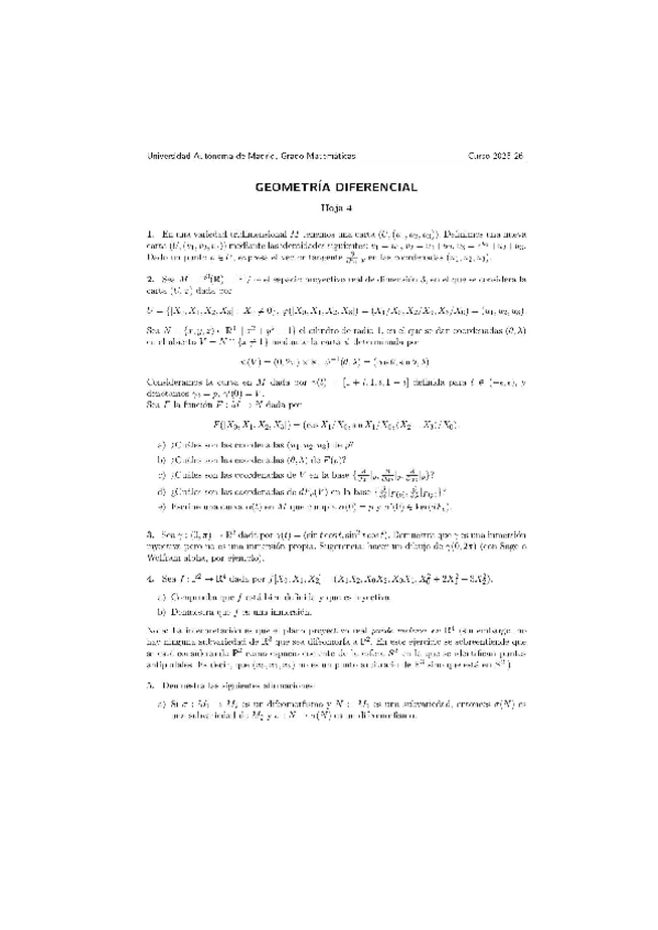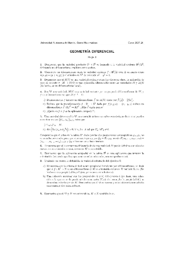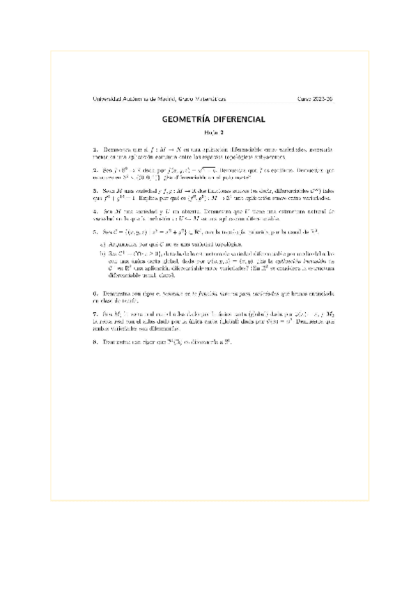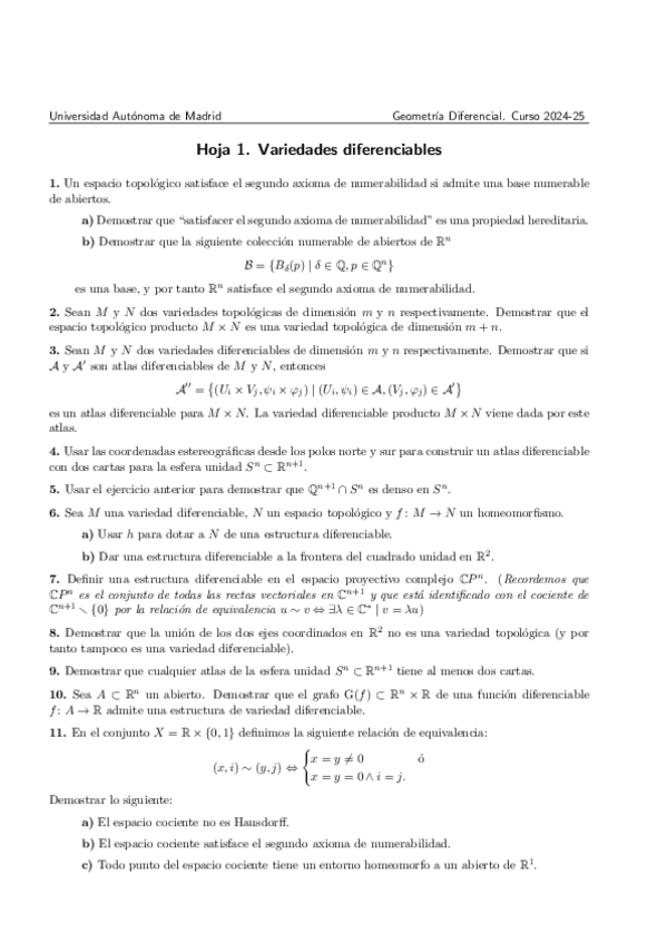 Soluciones completas de las hojas de ejercicios del curso 25-26 ERRORES: Hoja 1 ejercicio 5: en la propiedad 1 de topología, es φ(M U Ui) = φ(Ui) que es abierto, no la intersección