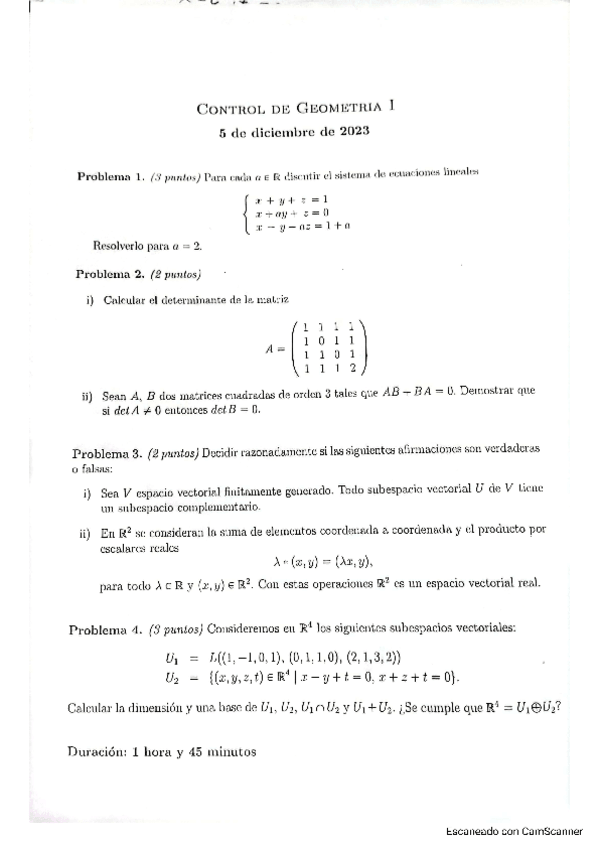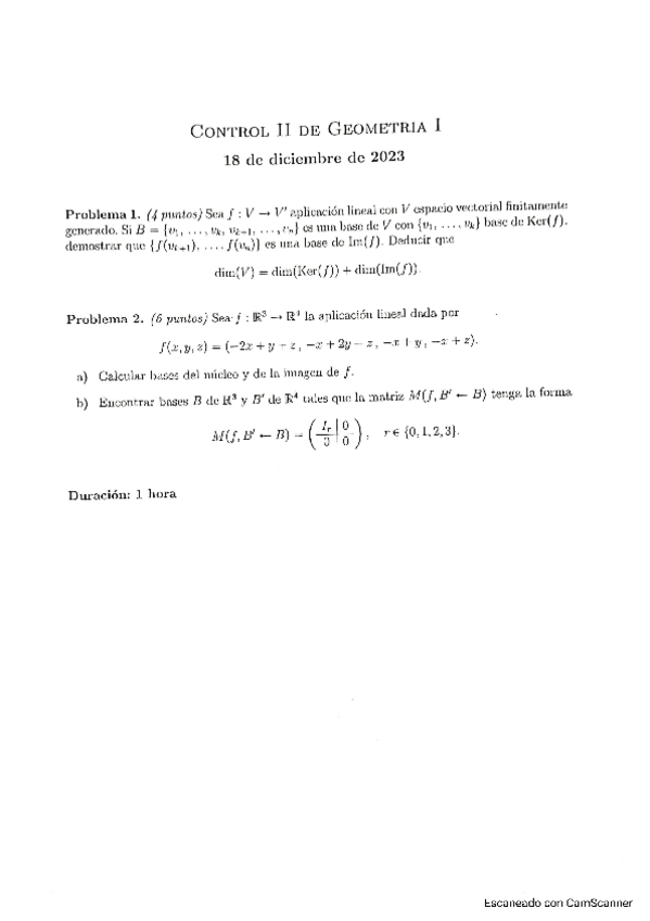 Examen Ordinaria y Extraordinaria Geometría I 2023