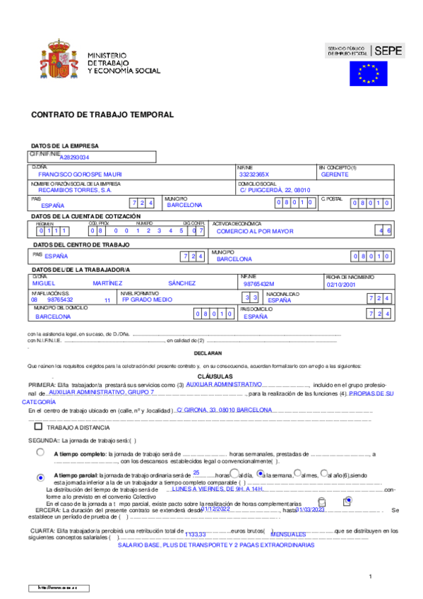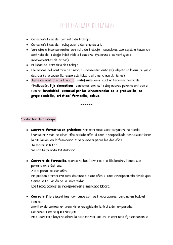 En este documento podrás encontrar información sobre todos los diferentes contratos que puede tener el personal en una empresa. Explican características, el significado y un ejemplo de cada contrato de trabajo.