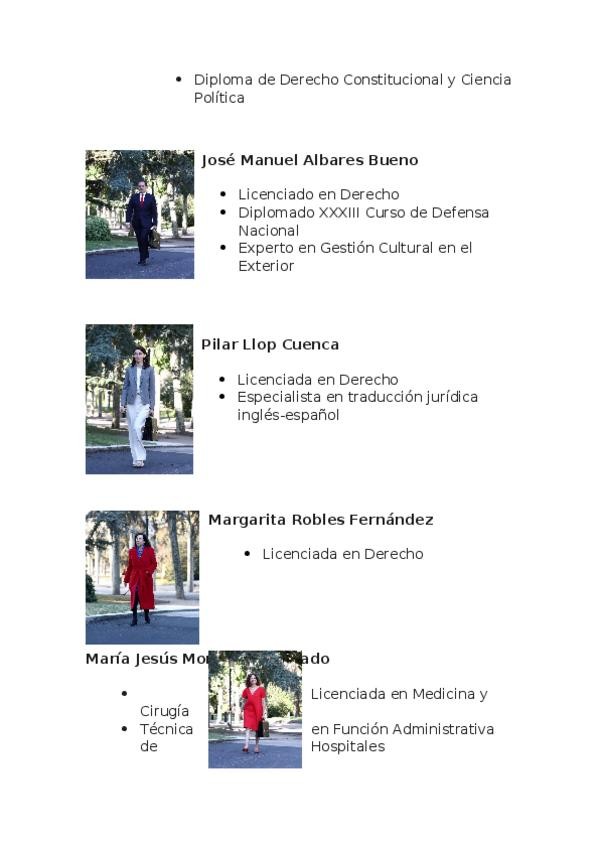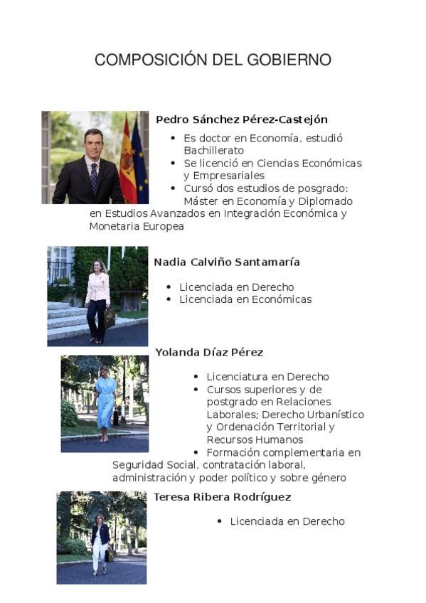 Ejercicio sobre la composición del Gobierno actual, incluyendo la identificación de sus miembros y su formación académica. Material orientado al estudio y repaso de contenidos de actualidad política.