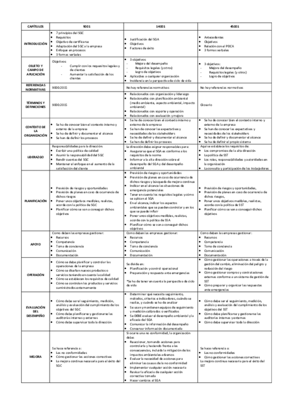 Esta tabla ayuda a entender mejor todas las distintas normas ISO en los capítulos de Apoyo y Operacióny las resume