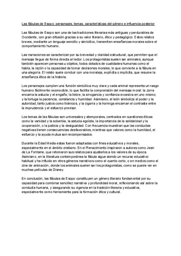 Literatura de Griego para la PAU. Tema Las Fabulas de Esopo: personajes, temas, características del género e influencia posterior.