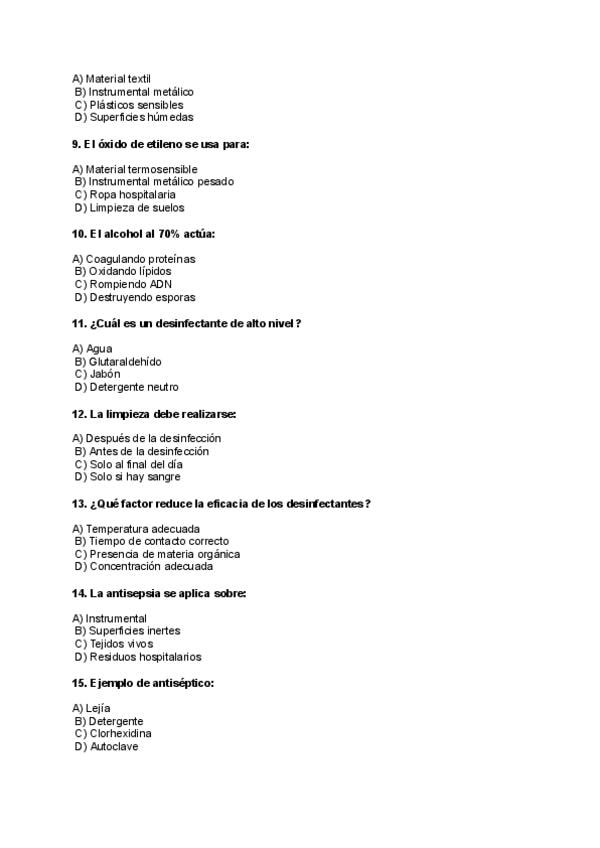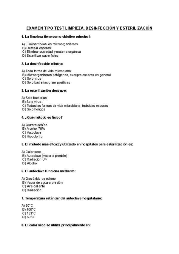 En este documento encontrarás un examen tipo test de Limpieza, Desinfección y Esterilización que contiene 40 preguntas. Además, podrás consultar las respuestas en este mismo documento. Mucha suerte y, ¡Ánimo!