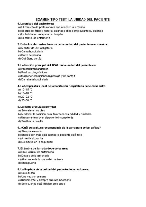 En este documento encontrarás un examen tipo test de la Unidad del Paciente que contiene 20 preguntas con sus respuestas. Mucho ánimo.