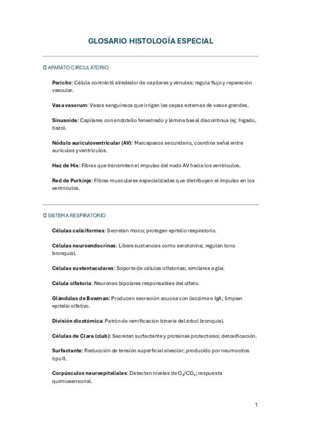 Glosario que sirve como guía y repaso general de última hora. Incluye términos fundamentales para el examen de histología especial.