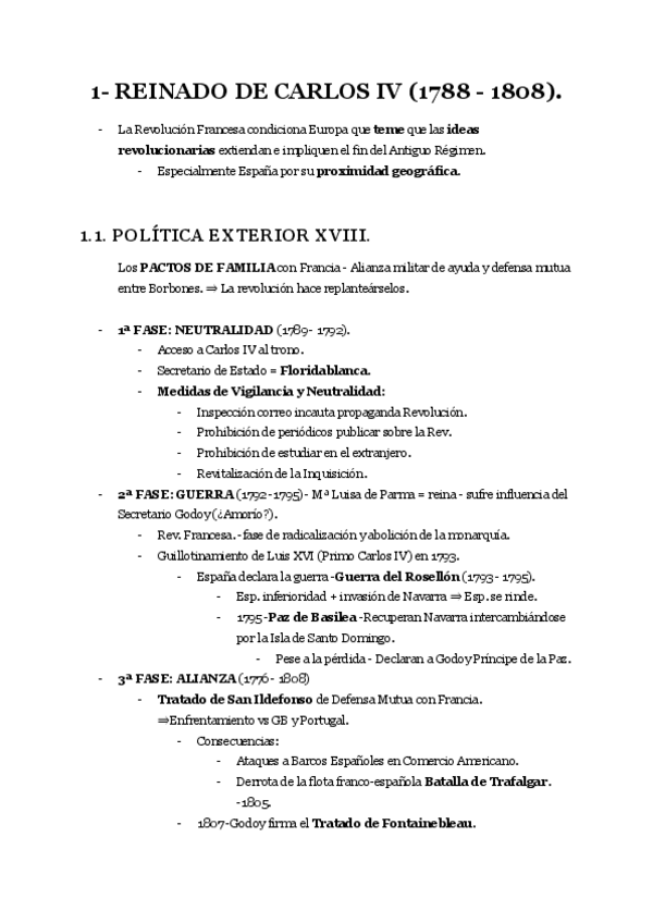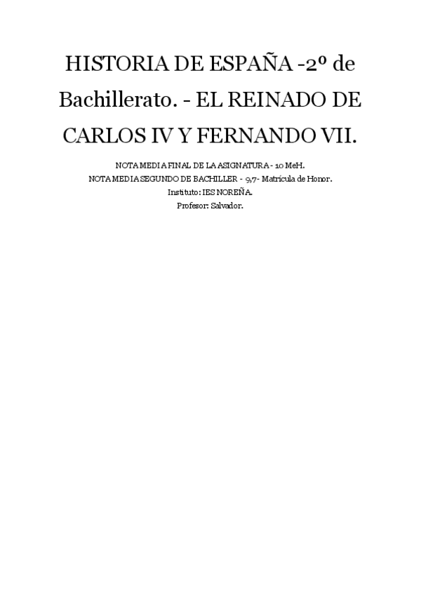 Apuntes completos Historia de España del Reinado de Carlos IV y Fernando VII -Calificación: 10.