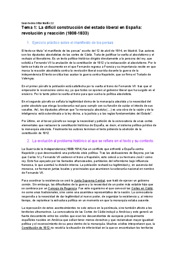 El comentario sobre el manifiesto de los persas. Y el estado liberal en España de 1808 a 1833