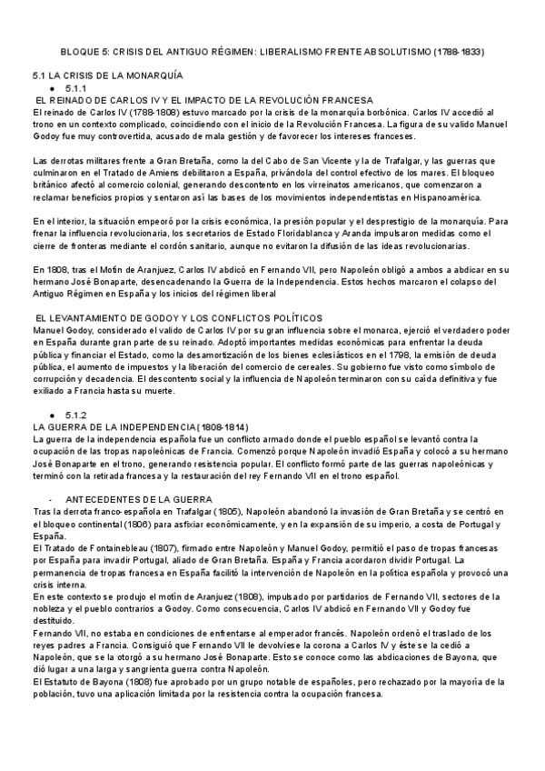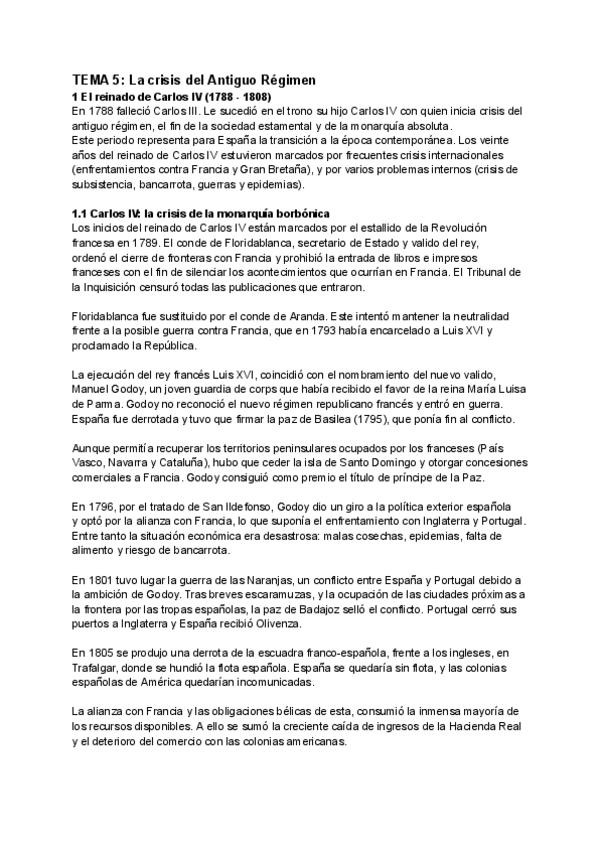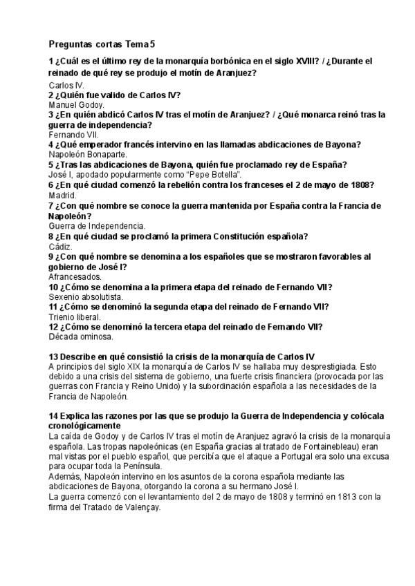 Preguntas cortas de Historia de España. TEMA 5: La crisis del Antiguo Régimen