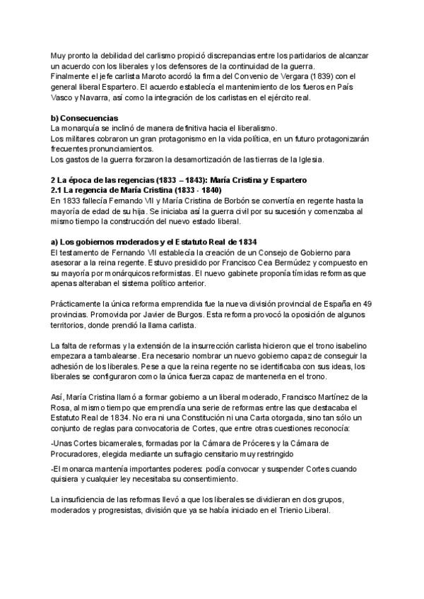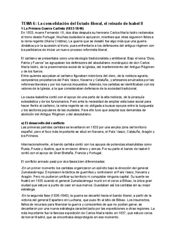 Apuntes de Historia de España (2º de Bachillerato) sobre la Primera Guerra Carlista y el proceso de implantación del liberalismo en España. Incluye bandos enfrentados, desarrollo del conflicto, reformas liberales, Constitución de 1837 y regencia de Espart