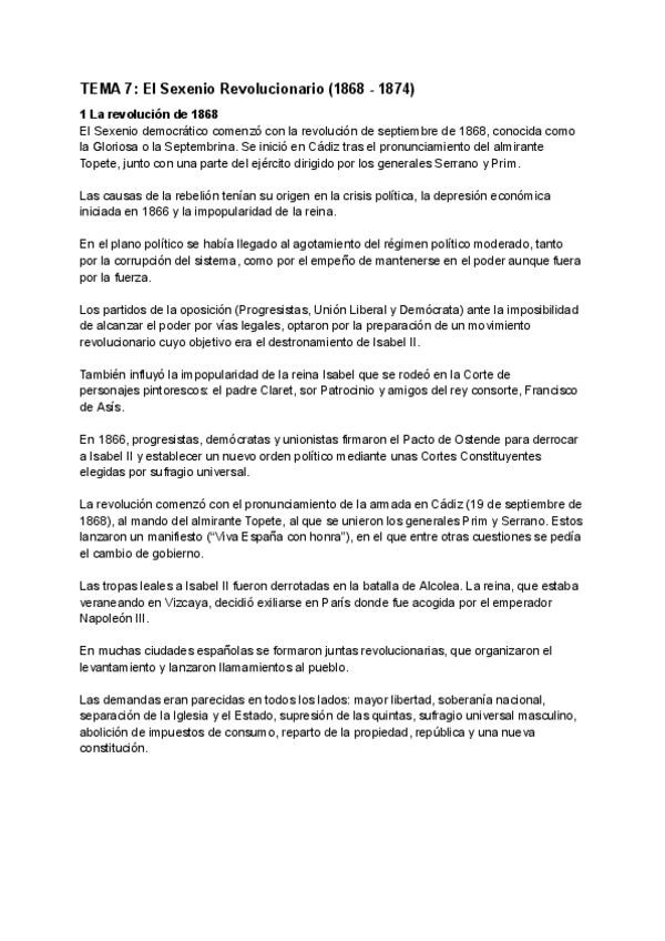 Apuntes de Historia de España. Tema 7: El Sexenio Revolucionario (1868 - 1874)