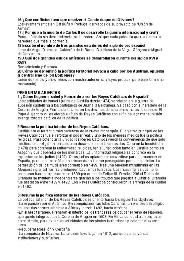 Preguntas cortas de Historia de España. TEMA 3: La monarquía hispánica de los Reyes Católicos a los Austrias