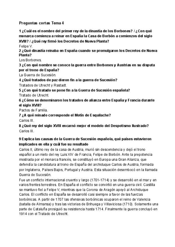 Preguntas cortas de Historia de España. TEMA 4: El siglo XVIII los primeros Borbones