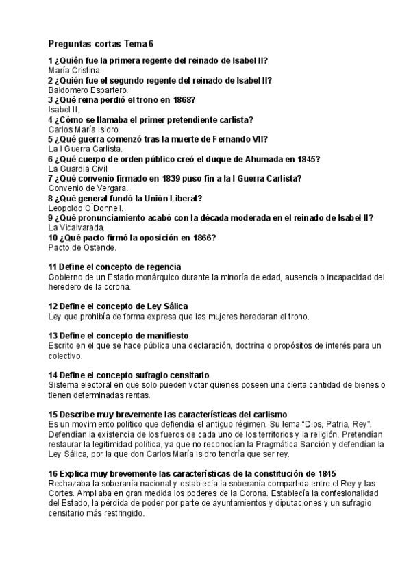 Preguntas cortas de Historia de España. TEMA 6: La consolidación del Estado liberal, el reinado de Isabel II