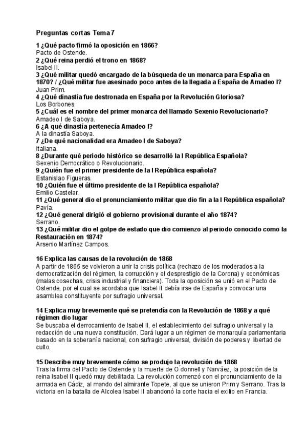 Preguntas cortas de Historia de España. TEMA 7: El Sexenio Revolucionario (1868 - 1874)
