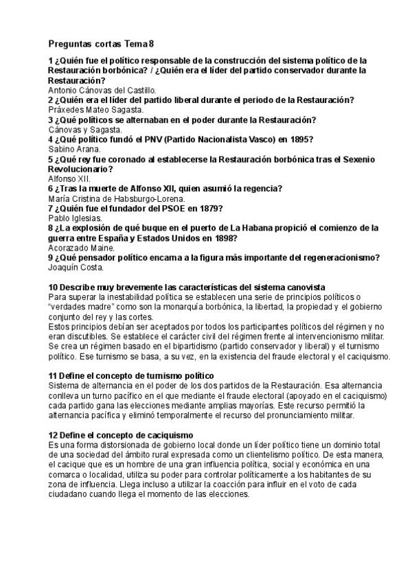 Preguntas cortas de Historia de España. TEMA 8: La Restauración
