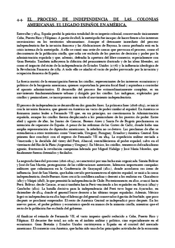 4.4. EL PROCESO DE INDEPENDENCIA DE LAS COLONIAS AMERICANAS. EL LEGADO ESPAÑOL EN AMÉRICA. resumen para la PAU