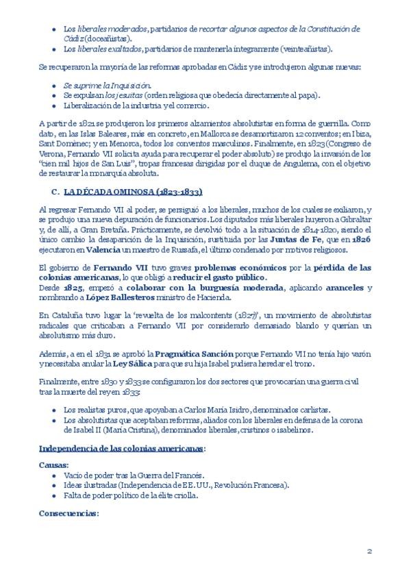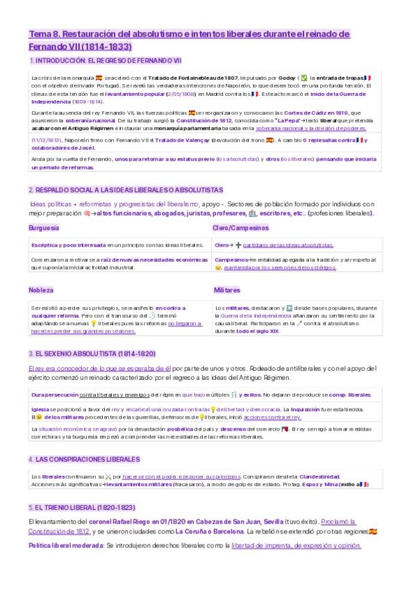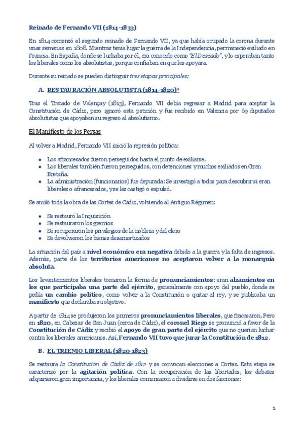 Apuntes de Historia de España (2º de Bachillerato) sobre el reinado de Fernando VII, con el estudio de la restauración absolutista, el Trienio Liberal y la Década Ominosa, así como la independencia de las colonias americanas. Contenido claro y esquematiza