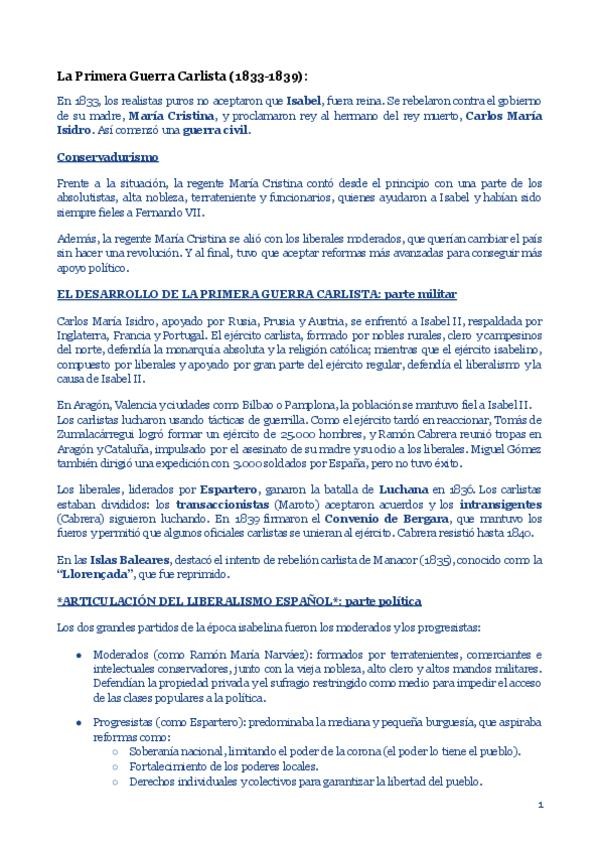Apuntes de Historia de España (2º de Bachillerato) sobre la Primera Guerra Carlista y el proceso de implantación del liberalismo en España. Incluye bandos enfrentados, desarrollo del conflicto, reformas liberales, Constitución de 1837 y regencia de Espart