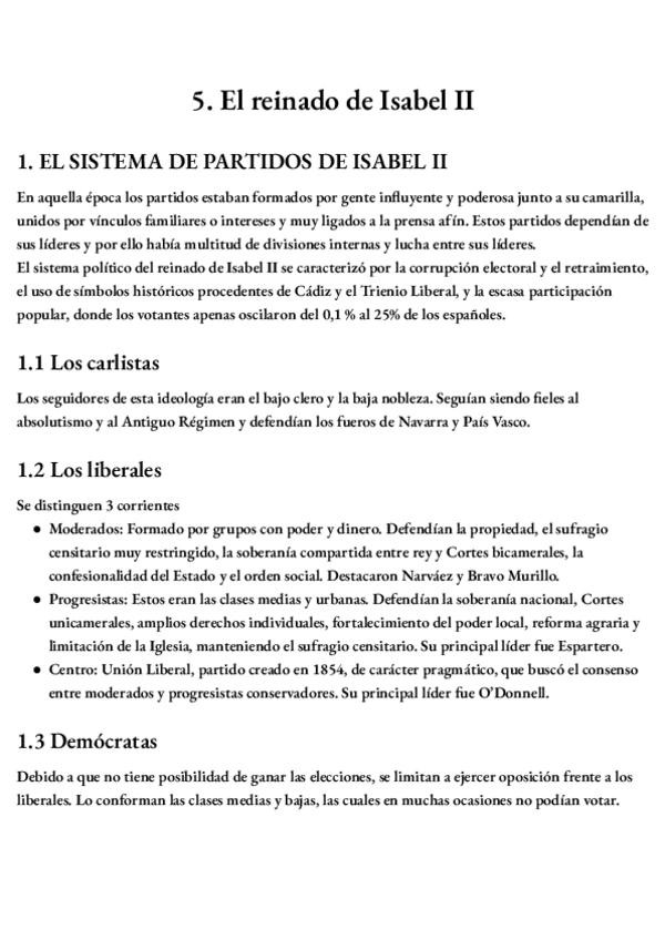 Apuntes resumidos con detalle del subtema 5 de historia de España, el reinado de Isabel. 2º Bachillerato