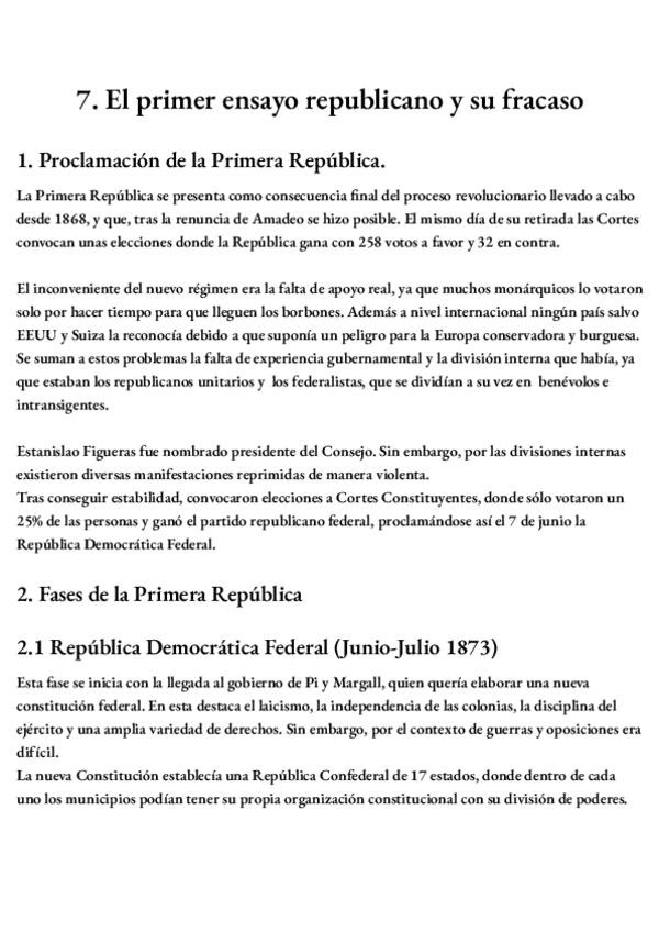 Apuntes resumidos con detalle del subtema 7 de historia de España, el primer ensayo republicano. 2º Bachillerato