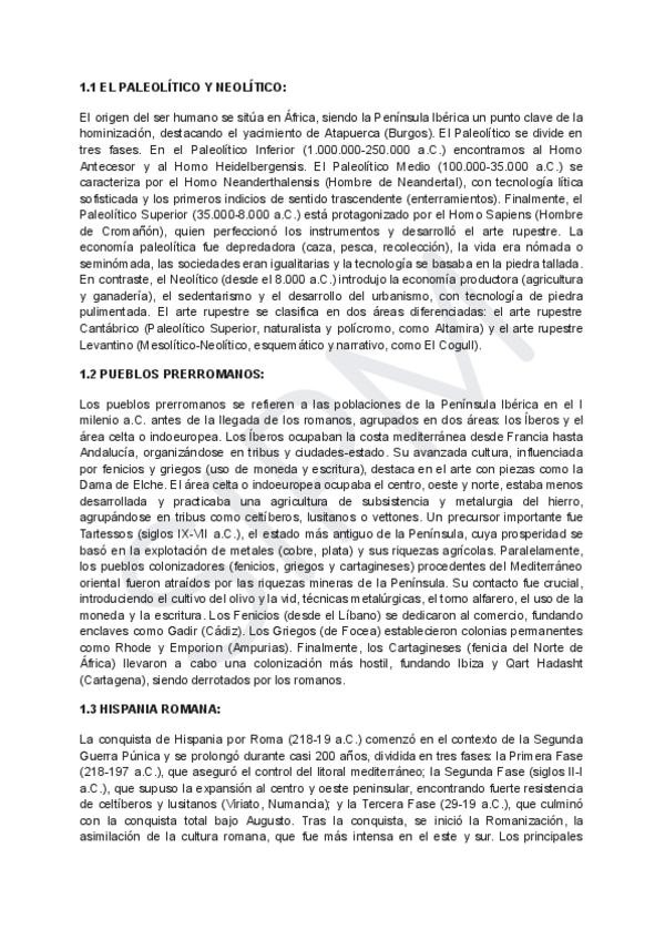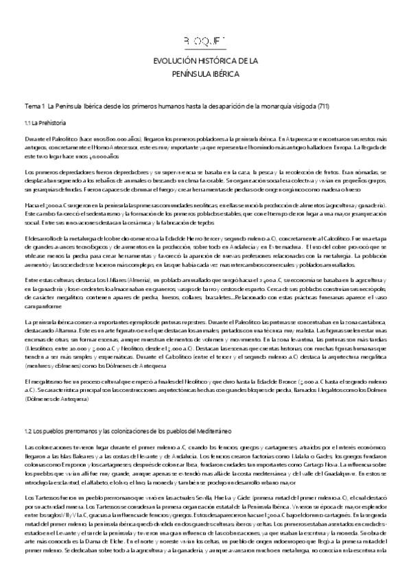 El bloque 1 de historia de España que pertenece a las preguntas cortas del examen de selectividad: La Península Ibérica desde los primeros humanos hasta la desaparición de la monarquía Visigoda (711). El resumen incluye uno extenso y redactado, un resume