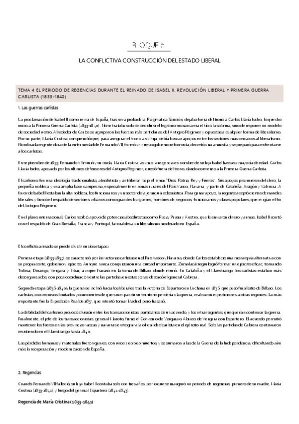 La conflictiva construcción del estado liberal (bloque 6) Temas: El periodo de regencias durante el reinado de Isabel II. Revolución liberal y Primera Guerra Carlista (1833-1840) / Construcción y evolución del estado liberal durante el reinado de Isabel I