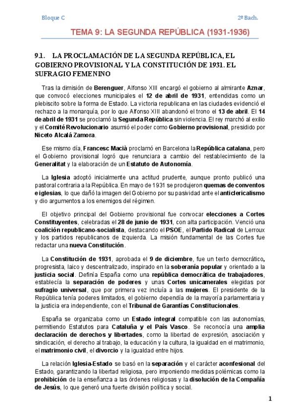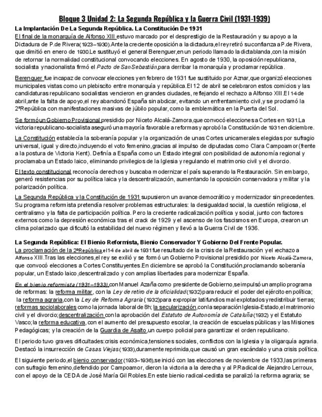 Apuntes de Historia de España Bloque 3 Unidad 2 Segunda República y Guerra Civil 1931 1939 pensados para 2º de Bachillerato y preparación de la PAU. Incluyen los temas de desarrollo más importantes del temario explicados de forma clara y ordenada para est